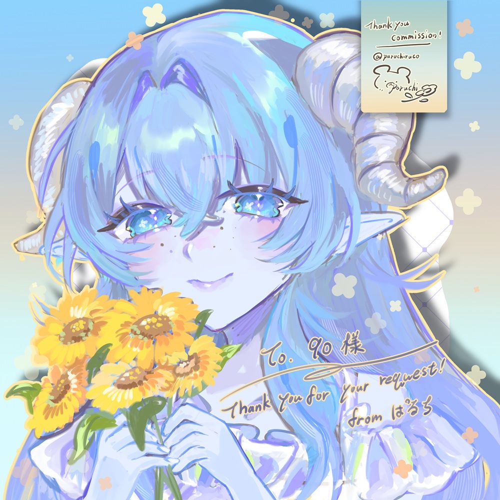 白いワンピースを着て向日葵を持つ美しいミナちゃんを描いていただけました!!