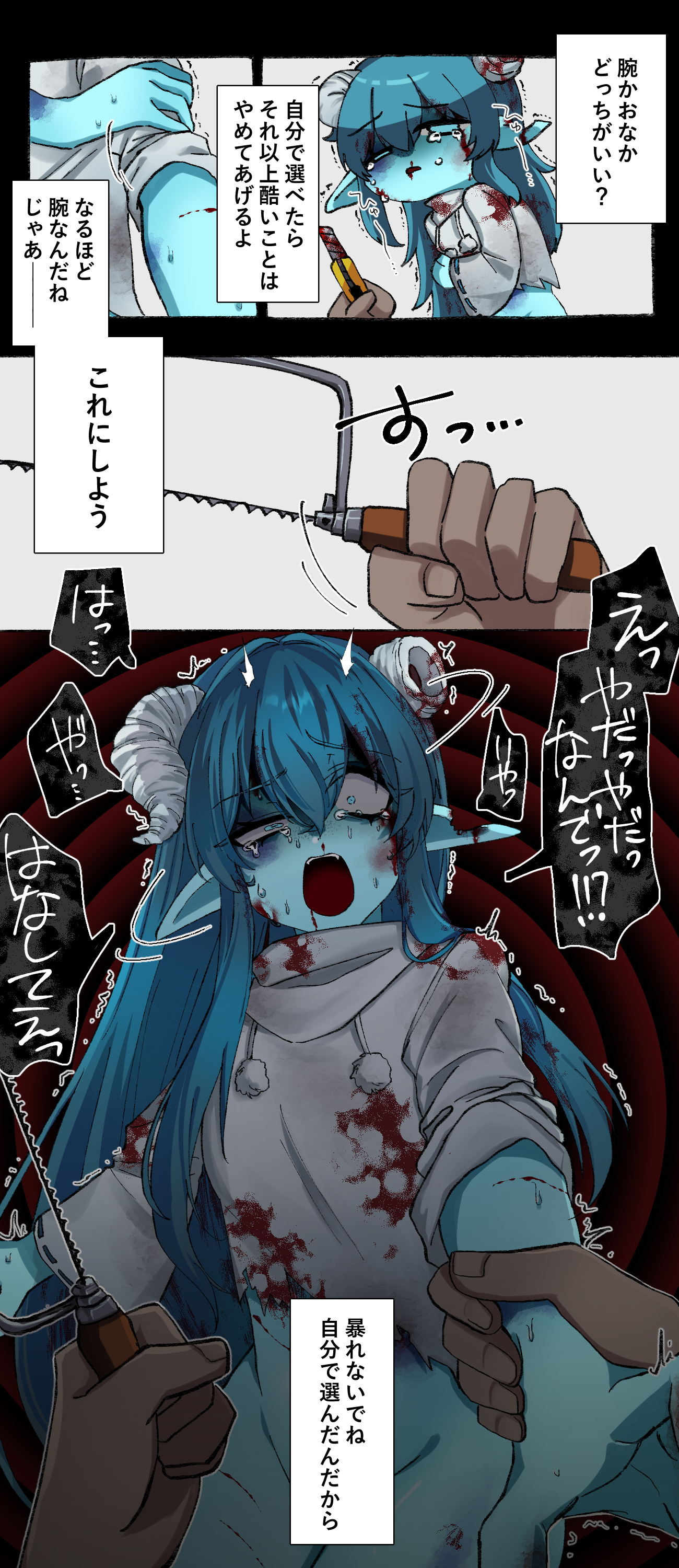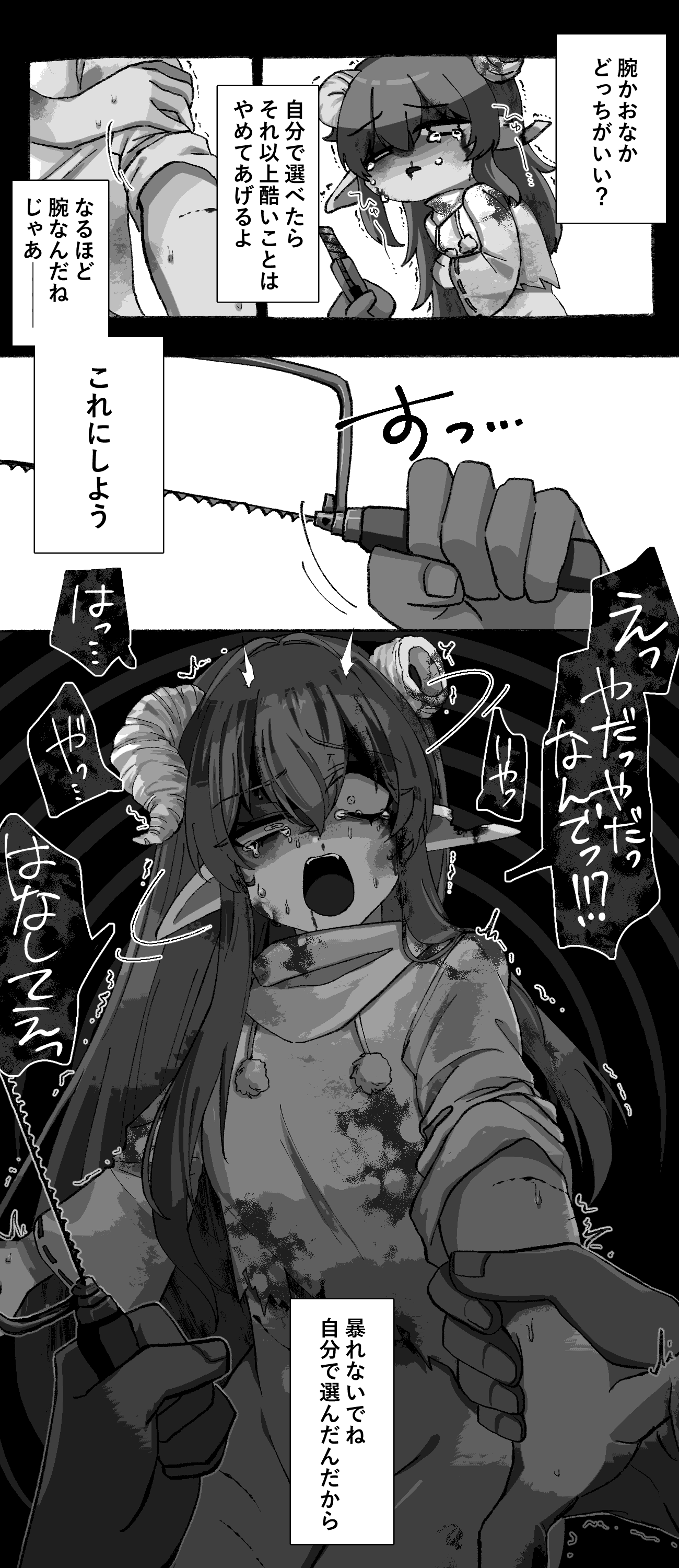 腕を差し出すと、糸鋸を取り出されて……。なリョナ漫画!